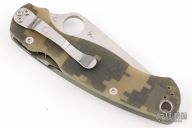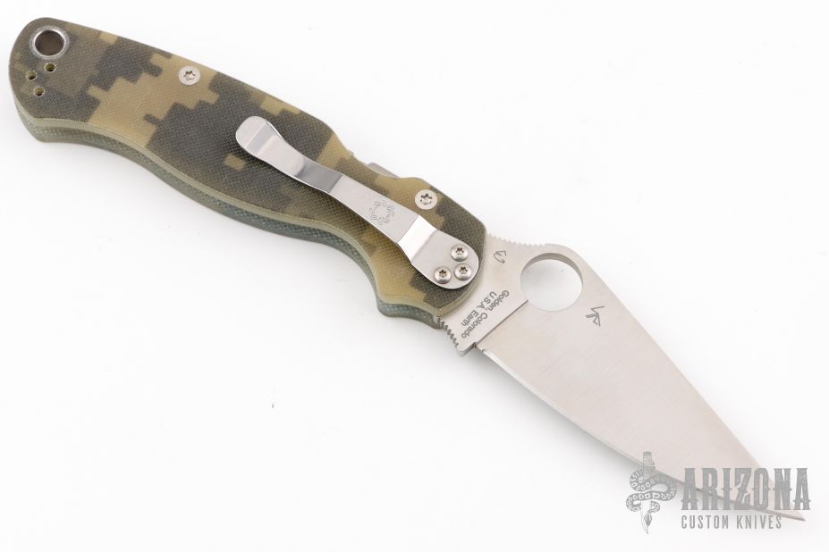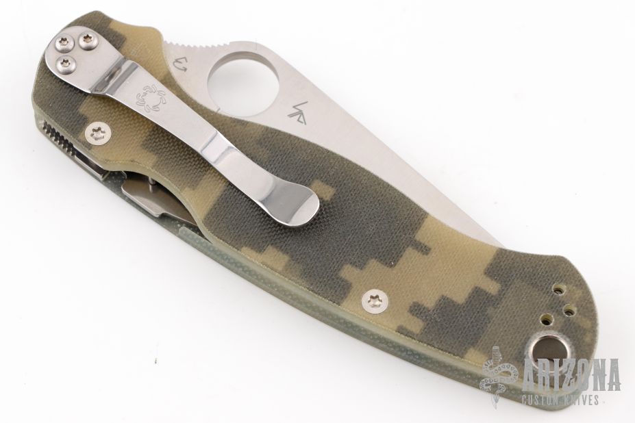 This Paramilitary 2 Linerlock Folder has a satin clip point blade with thumb hole and notched thumb rest. Handle is digi camo G10 with stainless steel liners and stainless steel 4-way reversible clip. Comes with original box and papers. Has some light scuffs, excellent condition otherwise.