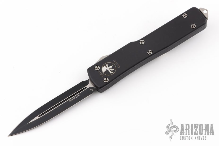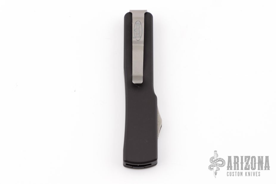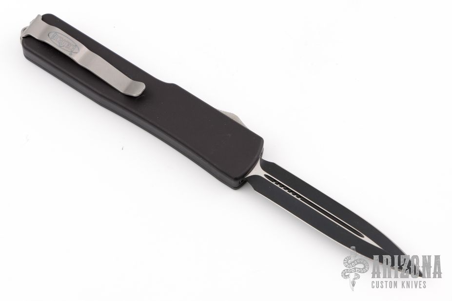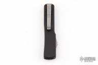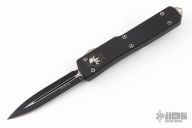 This UTX-70 OTF automatic by Microtech features a black double-edged blade with a standard edge. The handle has a black aluminum frame with blasted stainless steel tip down clip. Serial number 43819 and dated 03/2011. Comes with original box, nylon belt sheath, and papers. Has some light scuffs and scratches on the body, great condition otherwise.
