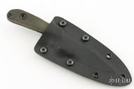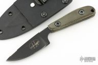 This knife by Mark Hazen features a black blade with notched thumbrest and notches near the tip, .191" blade stock and 1.062" blade depth, full tang construction. The handle has micarta scales. Comes with a kydex sheath. Has a couple light scuffs, otherwise excellent condition.