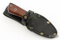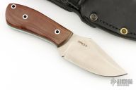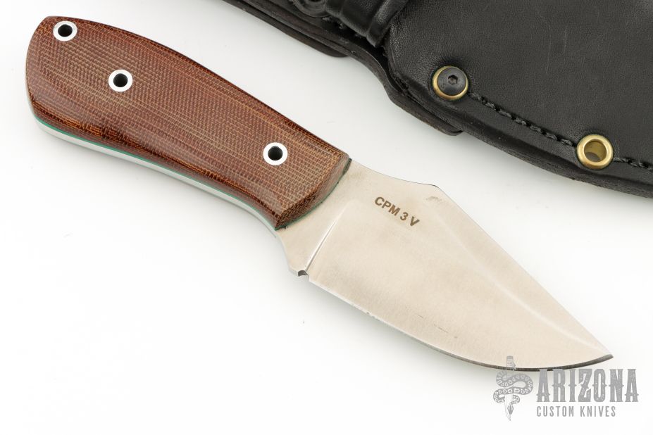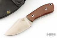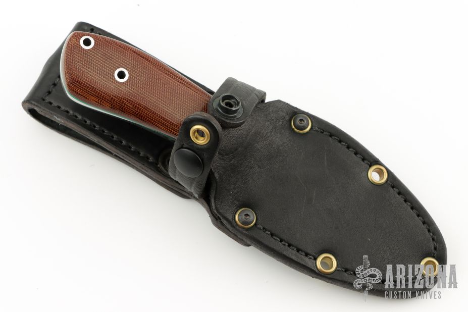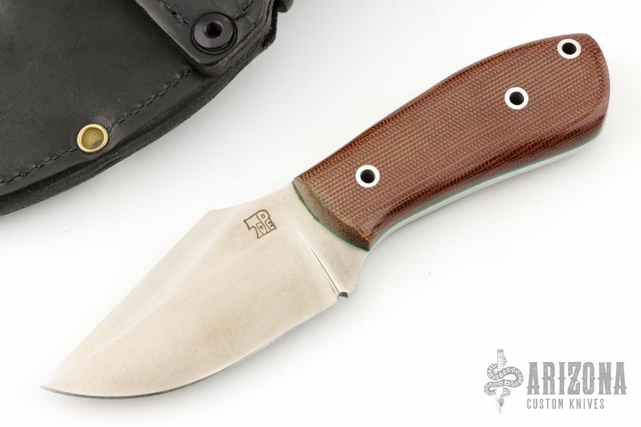 This knife by Dan Tope features a bead blast finished blade with false top edge, .159" blade stock and 1.577" blade depth, full tang construction. The handle has micarta covers, and green G-10 liners, lanyard hole at the butt. Comes with leather belt sheath. Excellent condition.
