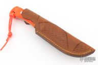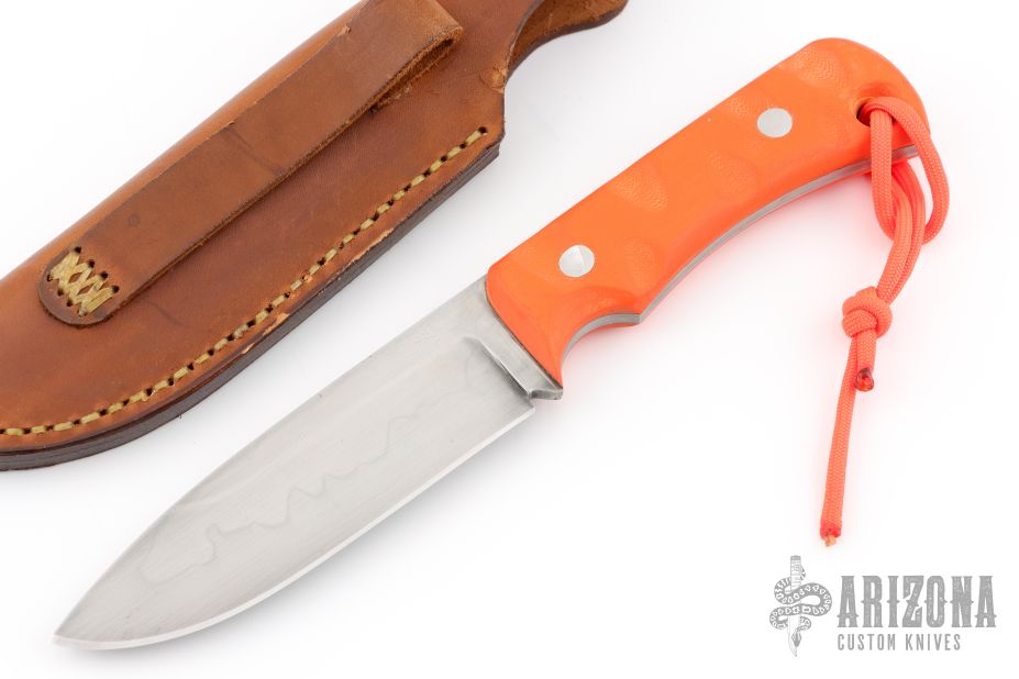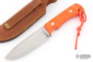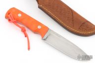 This knife by A, Sharpe features a hand rub satin finished blade with visible temper line, .176" blade stock and 1.335" blade depth, full tang construction. The handle has sculpted orange g10 covers with lanyard hole in pommel. Comes with a leather sheath. Has some light scuffs, excellent condition otherwise.