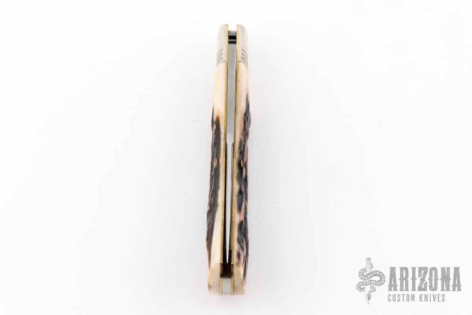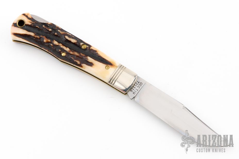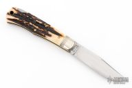 This Trapper by Northfield Knives features a satin polished blade with nail nick. The handle has nickel silver pinched bolsters, stag covers with a nickel silver escutcheon, brass liners/pins.  Comes with original tube. Excellent condition. #126