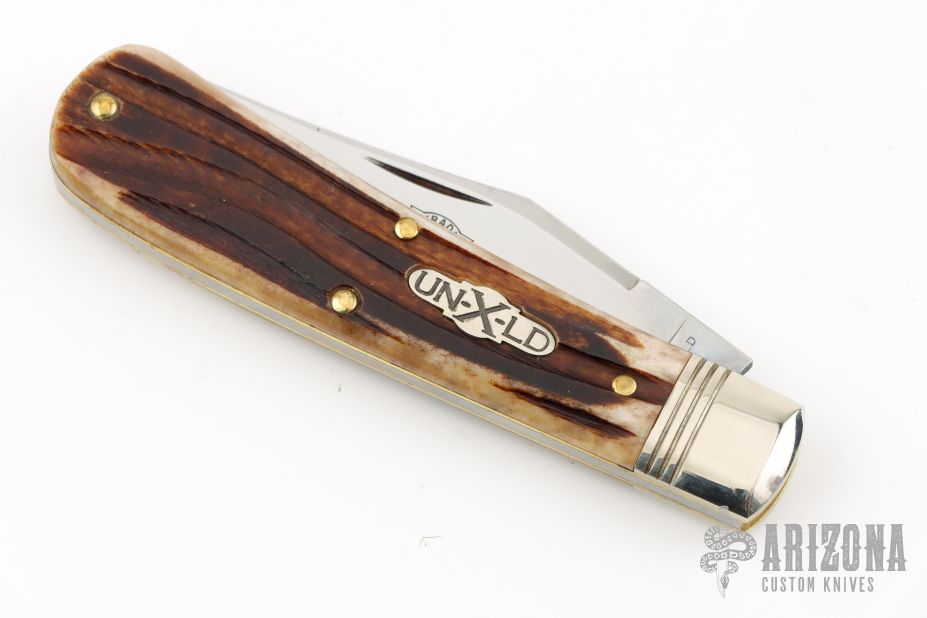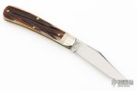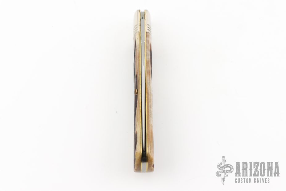This Stallion by Northfield Knives features a polished blade with nail nick. The handle has nickel silver fluted bolsters, cougar claw bone covers with brass liners/pins, steel spring. Has half-stop.  Comes with original tube. Excellent condition. 243 Made.