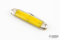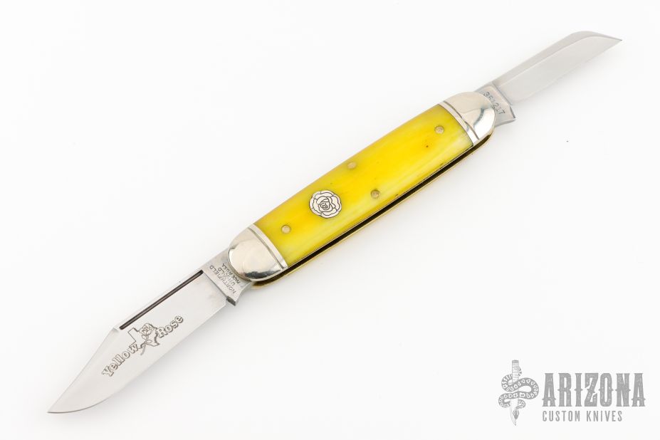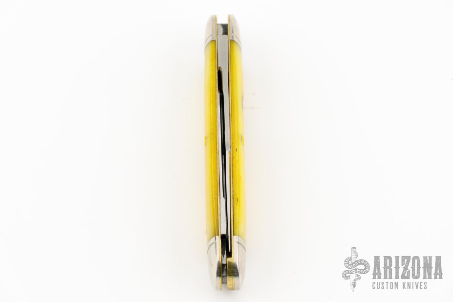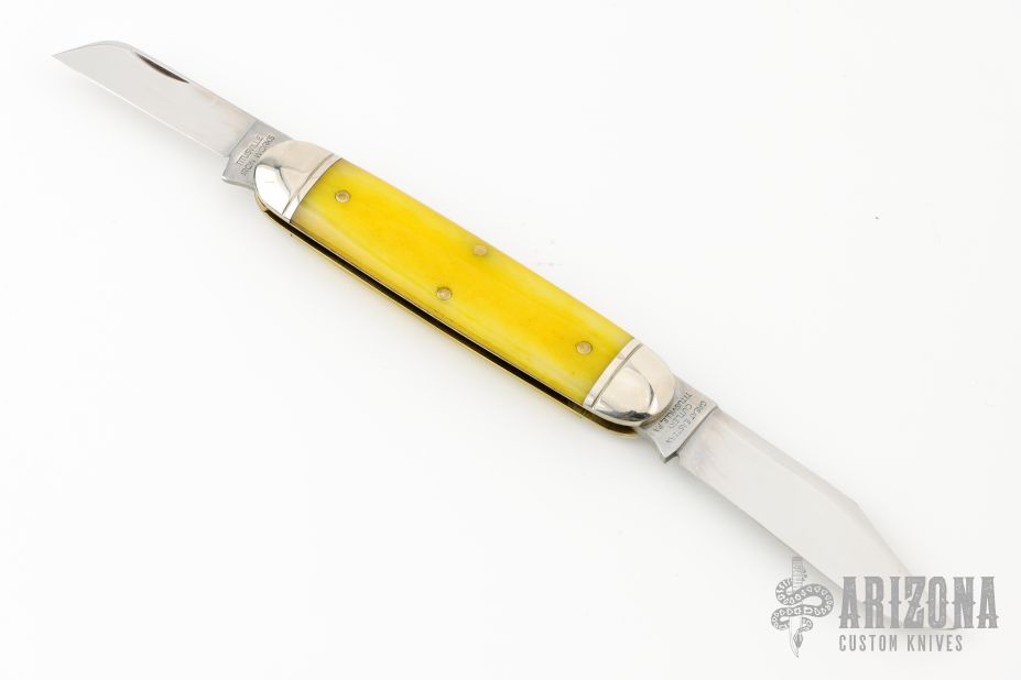 This slipjoint from Northfield features 2 polish blades with nail nicks. The handle has nickel silver bolsters, smooth yellow rose bone covers with brass liners, and steel spring. Includes original packaging. Excellent condition. 289 made.