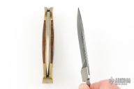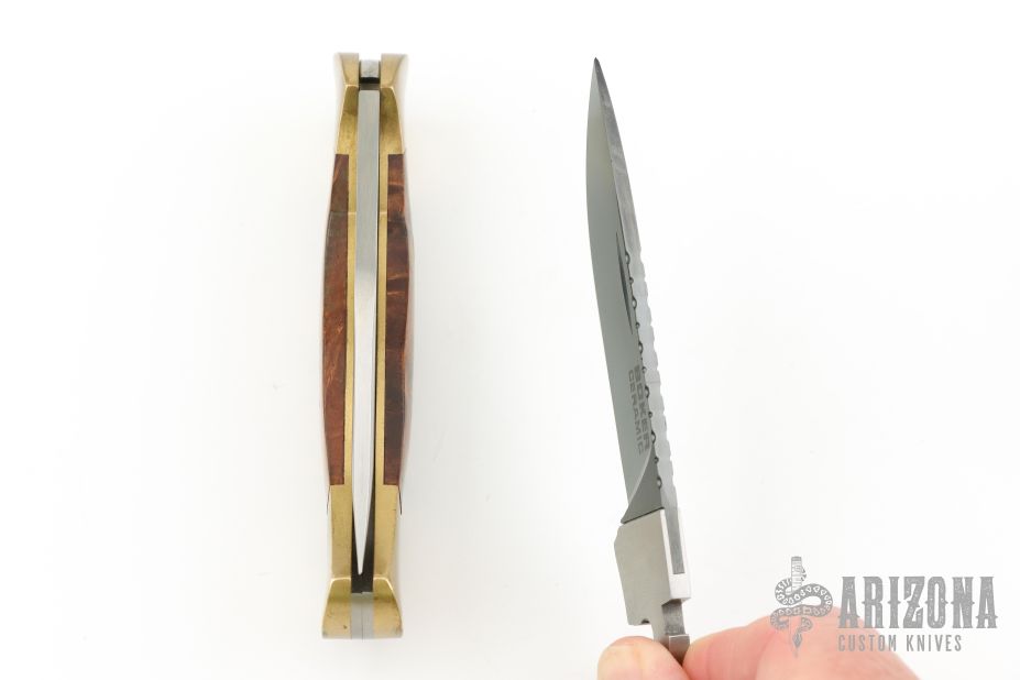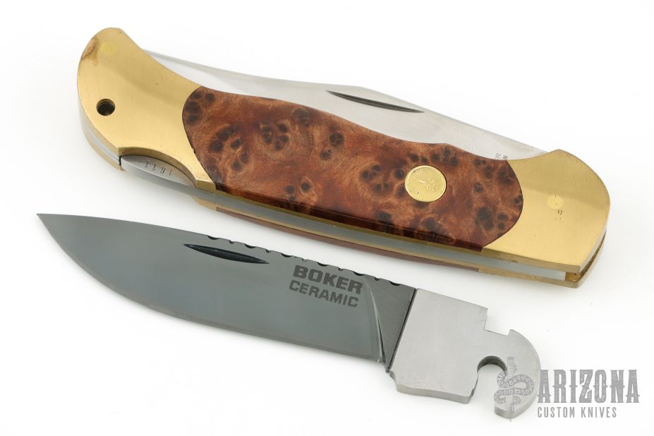 This knife by Boker features a satin finished clip point blade with nail nick. The handle has a brass frame with thuja burl wood inlays. Comes with original nylon sheath and and interchangable ceramic blade. Has a couple light scratches, otherwise excellent condition. #1611