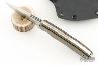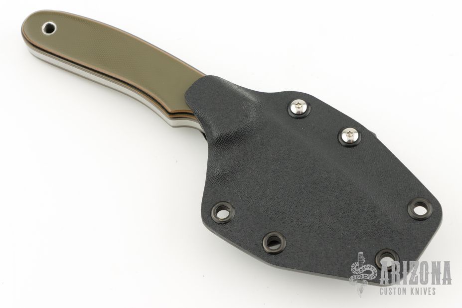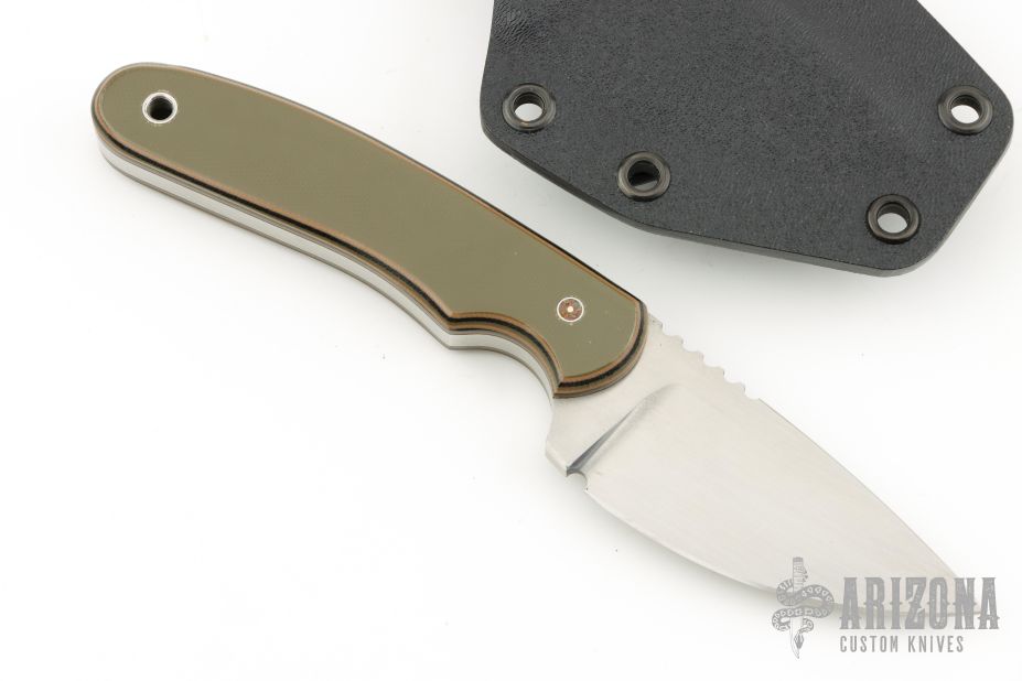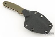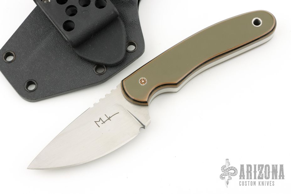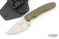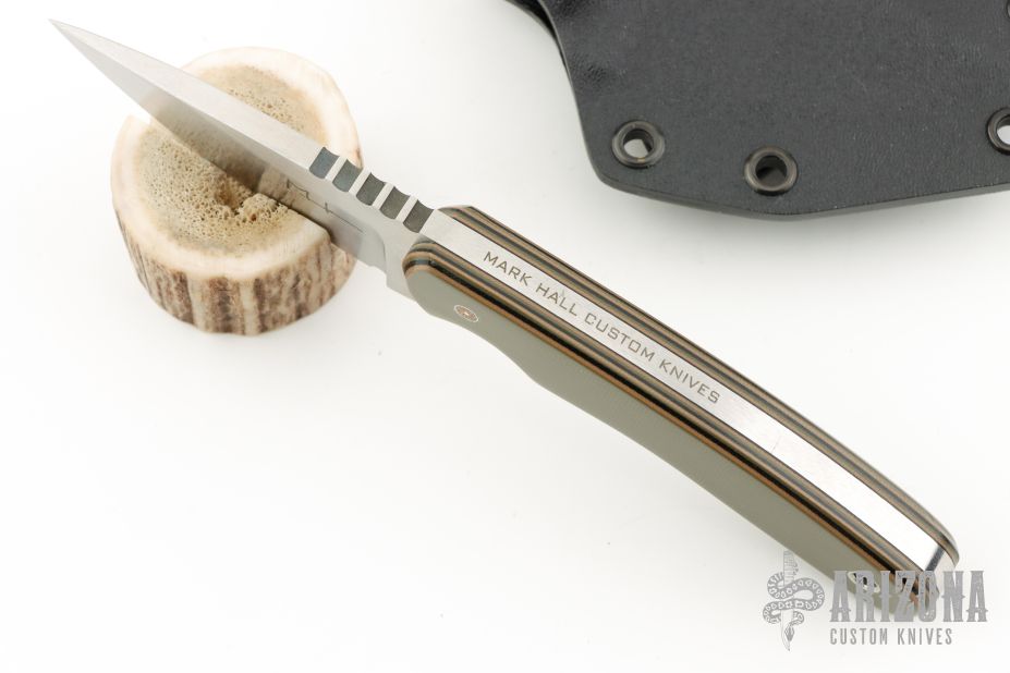 This Hunter from Mark Hall features a hand rub satin finished drop point blade with, notched thumb rest, .214" blade depth and 1.32" blade depth, full tang construction. The handle has pinned green/tan/black G10 covers with lanyard hole in pommel. Comes with a Kydex belt sheath. Has some light scuffs and scratches, great condition otherwise.