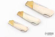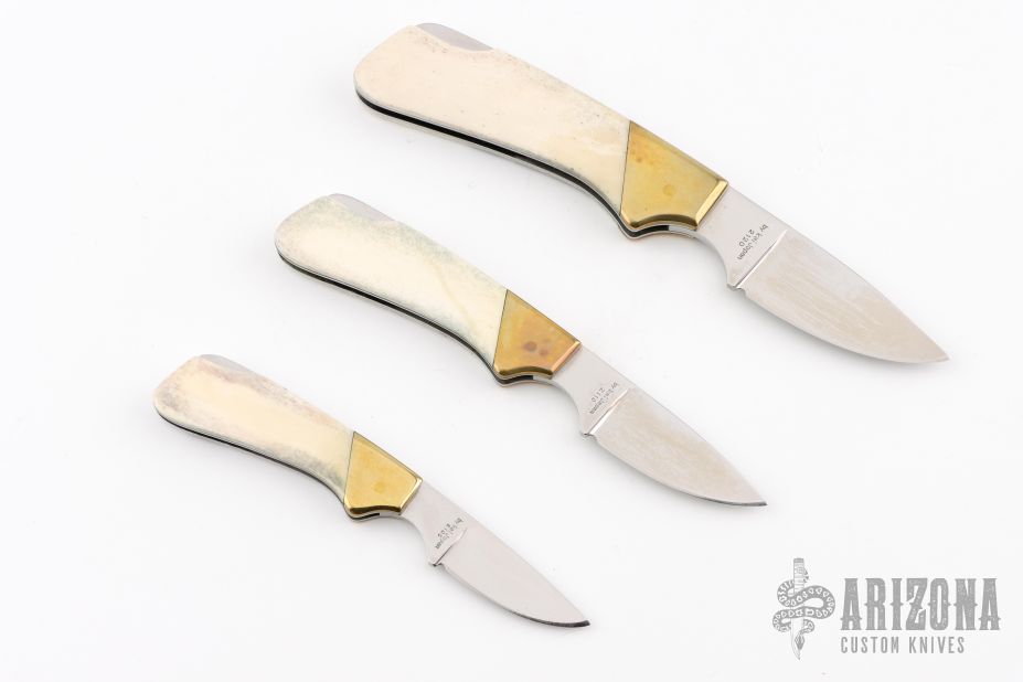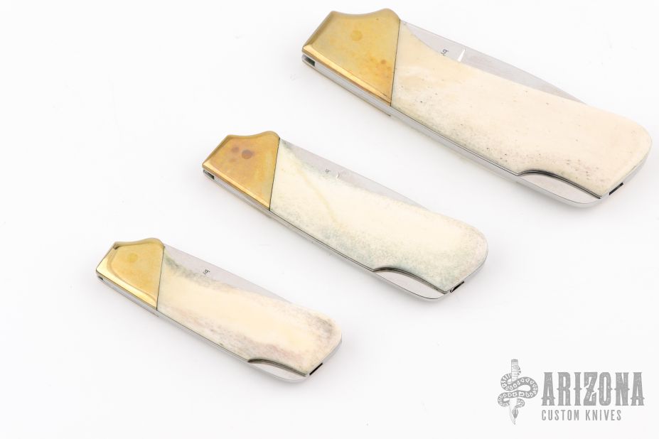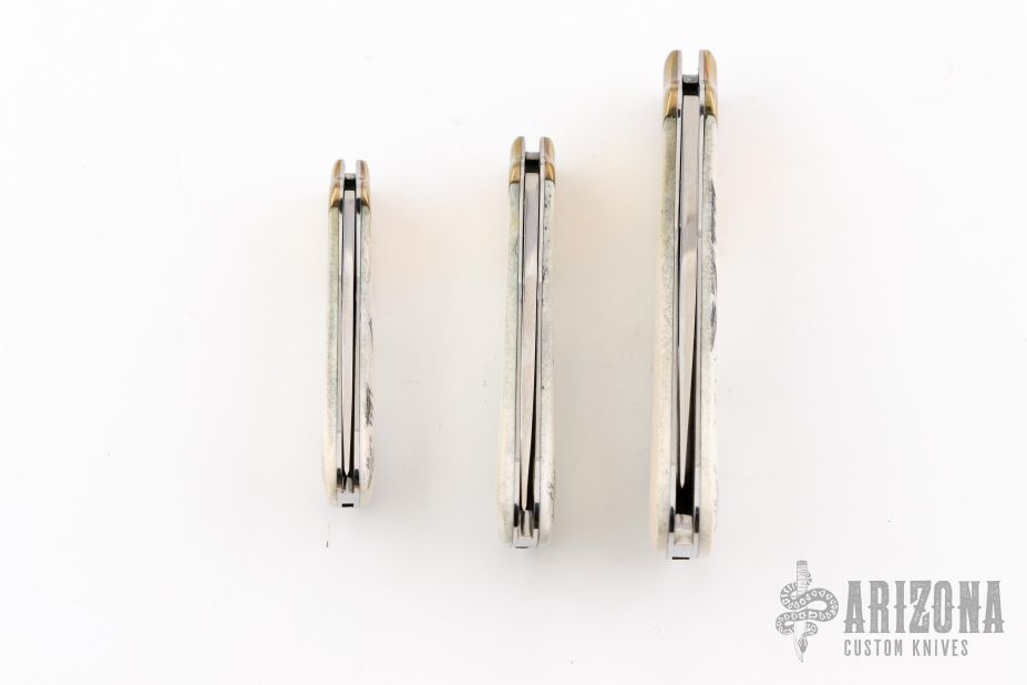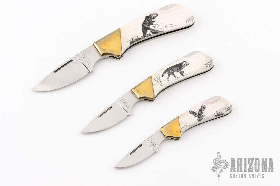 This vintage lockback by Kershaw features a mirror polished blade with nail nick. The handle has brass bolsters and stainless steel liners, bone scales with scrimshaw by G. Harbour dated '84. All three are #318/1000. Excellent condition. The bear is 6.75 overall, the wolf is 5.5" overall, and the eagle is 4.75" overall.