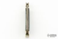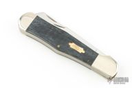 This Coke Bottle Slipjoint by Case features 2 mirror polished blades with nail nicks. The handle has nickel silver bolsters, blue bone covers with a brass shield, brass liners and stainless springs. Has half-stop. Has some light scratches, excellent condition otherwise.
