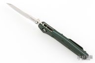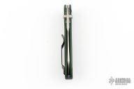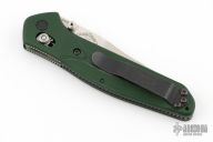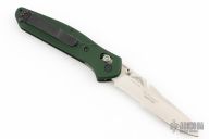 This 940SBK Osborne Axis Lock Folder from Benchmade has a stonewash finished partially serrated blade with false top edge and dual thumbstuds. Handle is green anodized aluminum with purple anodized spacer, and black finished stainless steel tip up clip (RH/LH Reversible). Nice action, blade seating and excellent lockup. Comes with original box and papers. Excellent condition.