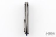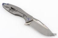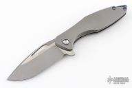 This Arius by Koenig knives features a stonewashed blade with thumbhole and flipper. The handle has a nicely milled and contoured tumble finished titanium frame with matching tip up clip and an anodized and tumbled titanium backspacer. Has ceramic bearings and a ceramic detent ball. Nice detent, lockup and blade seating. Comes with original box, cloth, hardware, and COA dated 6/8/18. Has a couple light scuffs and scratches, great condition otherwise.