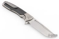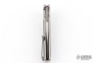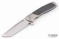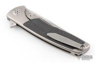 This full size EVO Flipper from Brian Nadeau features a belt satin finished blade, thumbhole, flipper and notched thumbrest. The handle is comprised of a bead blasted titanium frame with carbon fiber inlays, satin titanium tip up clip. Rides on bearings, nice detent, lockup and blade seating, stainless lockface insert. Comes with original box. Has scuffs, scratches, and is a little dirty. Great condition otherwise.