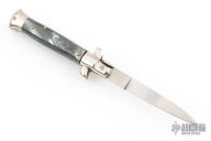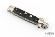 This 6" swivel bolster features a stone wash drop point blade. The handle has stainless steel bolsters, front and rear, buffalo horn scales, steel liners, stainless spring. Has been resharpened.  Has scuffs/scratches otherwise the knife is in good condition.