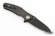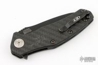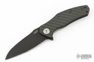 This 0770 Linerlock Flipper (#0660) has a black drop point blade with notched thumb rest. The handle has a carbon fiber frame with stainless steel single liner (lock), and black stainless steel tip up clip (RH/ LH reversible). Nice action, lockup and blade seating. Has some wear on the clip and some light scuffs, otherwise good condition.
