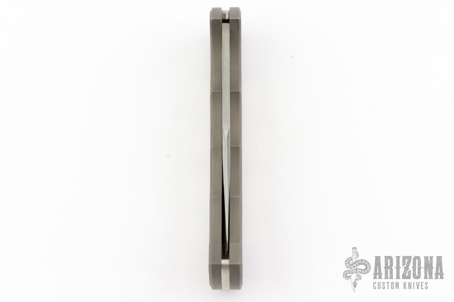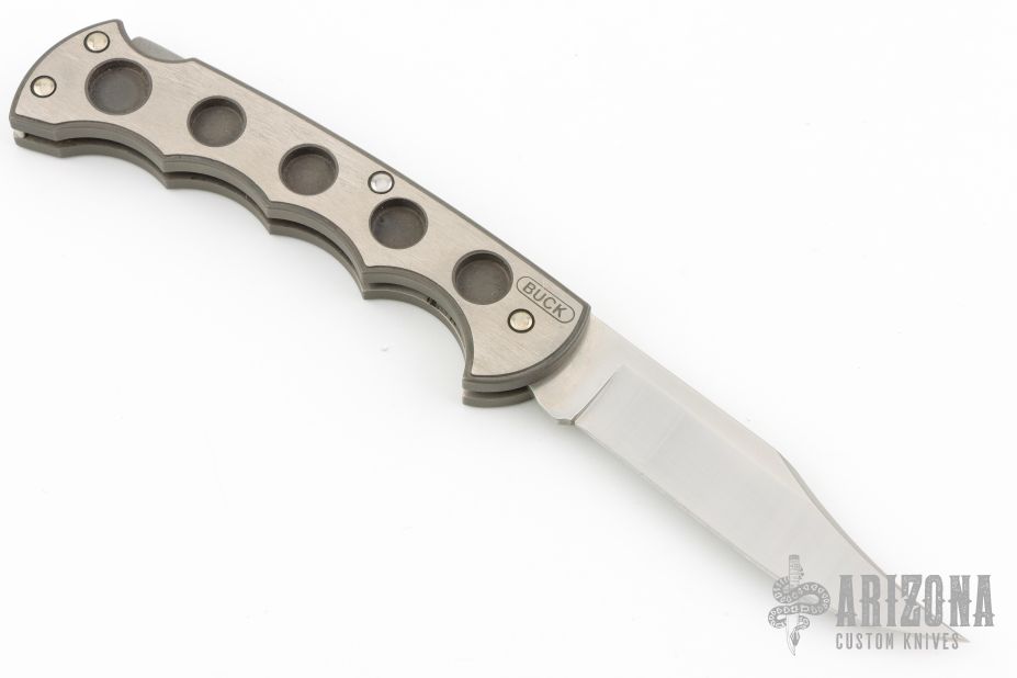 This knife by Buck Knives features a satin finished clip point blade with nail nick. The handle has a two-tone titanium frame. Comes with original nylon sheath. Has a couple light scratches, otherwise excellent condition.
