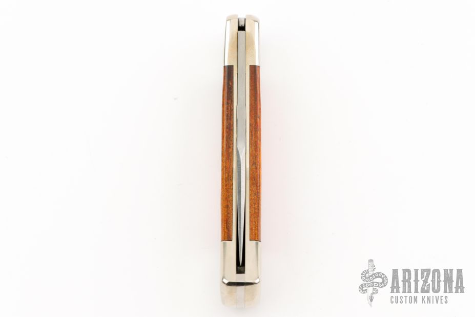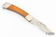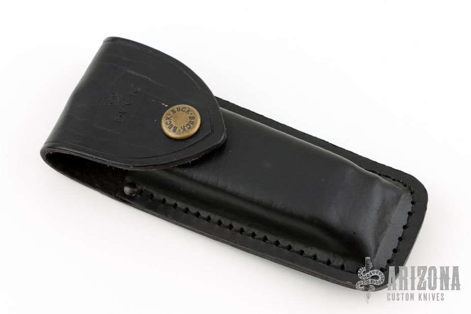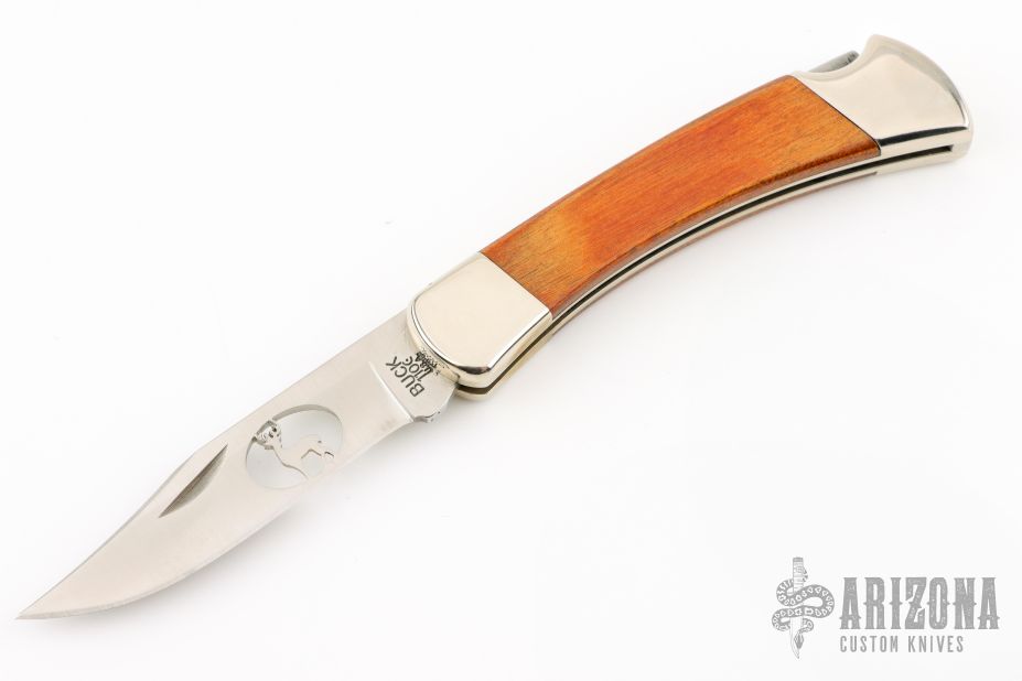 Buck model 110. Satin finished blade with nail nick and cutout of a buck. The handle has a nickels silver frame with wood scales. Has a few light scratches, otherwise excellent condition. Comes with a black leather sheath.
