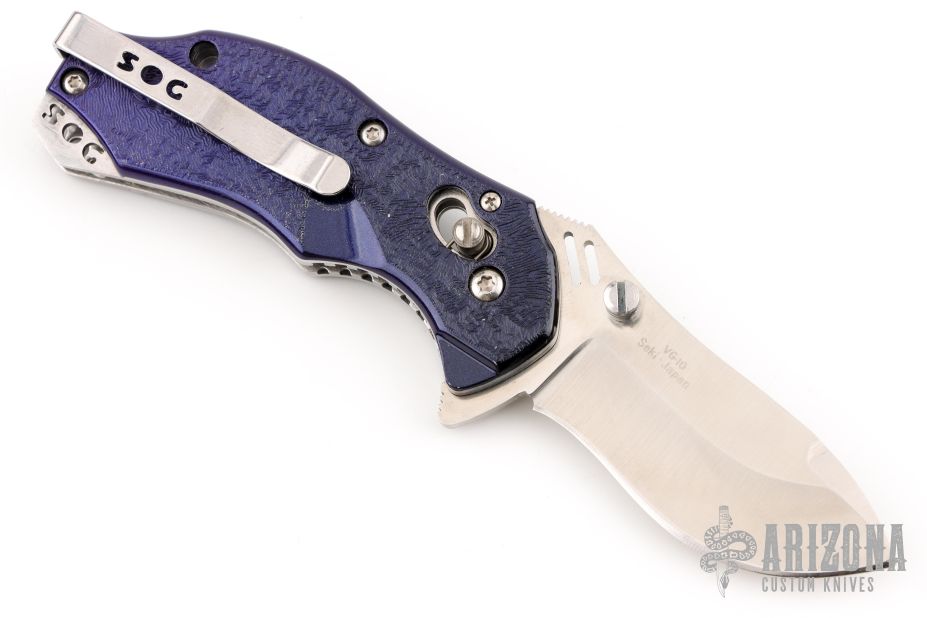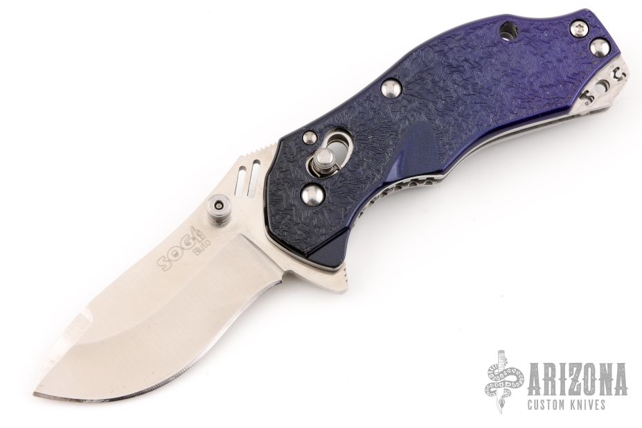 Maker statement: "The muscular stance and bulging form belay a quiet confidence. This little guy has its own point of view and the strength to back it up. With a very innovative textured machined aluminum handle, the Bluto handles well. Its VG-10 blade, Arc-lock and hardened scalloped steel liners make a rock solid package. The sweeping blade style is modern and functional and unique to the SOG line. Flex a new look with the Bluto. "