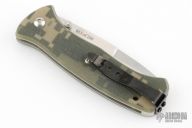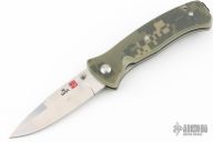 This SERE 2000 Linerlock Folder by Al Mar has a satin finish VG-10 stainless steel drop/ spear point blade with dual thumb studs. Handle is Digital Camo G10 over stainless steel liners, black stainless steel tip up clip, and lanyard hole. Excellent condition. #013 of 200