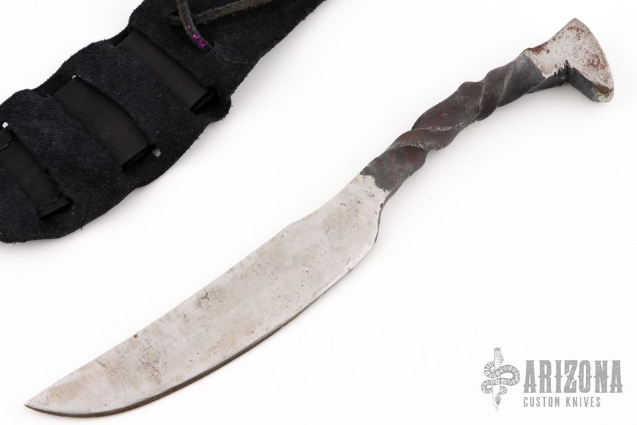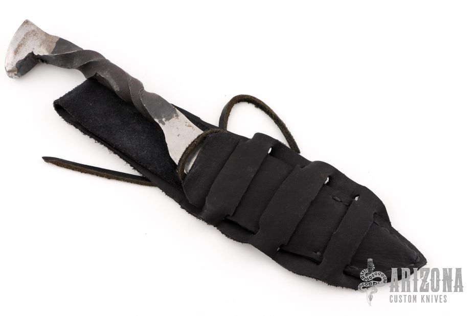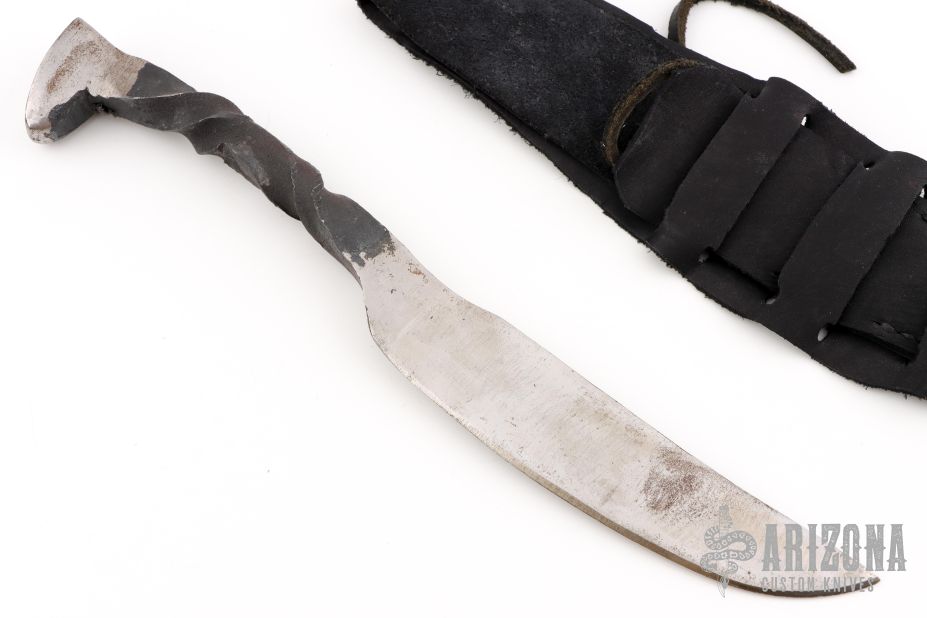 This Railroad Spike Knife features a hand forged satin finished blade with .225" blade stock and 1.187" blade depth, integral construction. Comes with a leather sheath. Has some light scratches and patina on the blade, otherwise excellent condition.