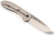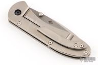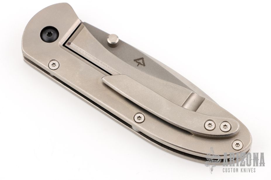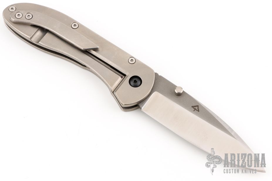 This framelock folder from Eric Kramer features a two-tone blade with swedge and dual thumbstuds, has a milled fuller and notched thumbrest on the spine. The handle has an orange peel finished titanium frame and tip up clip. Nice detent, lockup and blade seating. Excellent Condition. Comes with a zippered case.