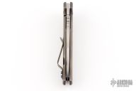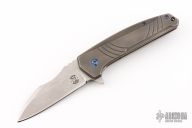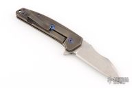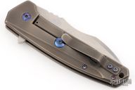 This Shard Mid-tech by Tom Krein features a stonewashed blade with notched thumbrest and flipper. The handle has a milled and darkened titanium frame with tip up clip and anodized titanium hardware. Comes with a zippered case. Has a couple light scuffs, otherwise excellent condition.