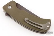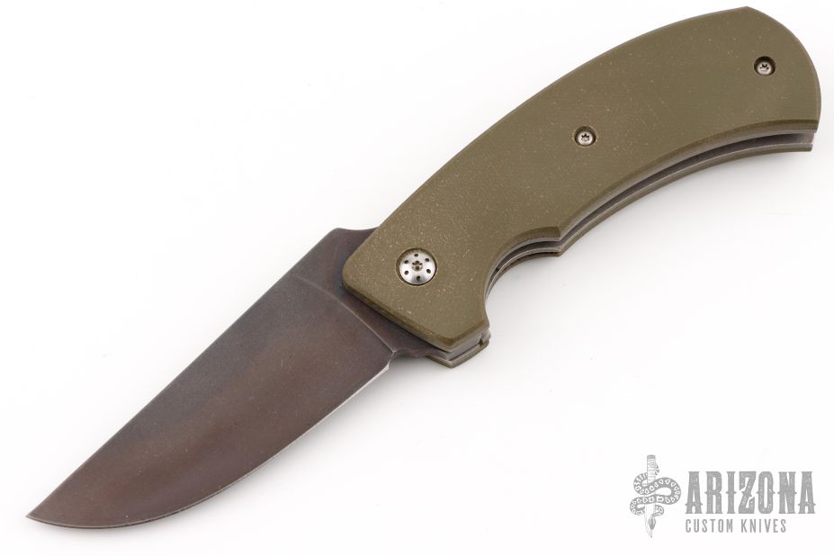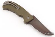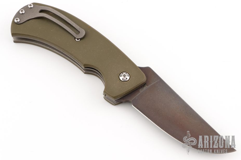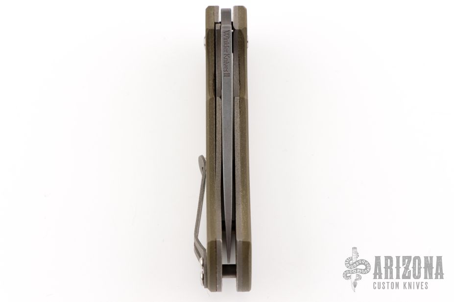This is the first folder from Winkler II Knives, the F-1 Flipper. It has a black Caswell coated CPM-3V high carbon steel blade with a flipper and smooth ball-bearing action. The handle has a green G-10 scales, bead blasted titanium liners and tip up pocket clip. Nice detent, lockup, action and blade seating. Excellent condition. Comes with a zippered case.