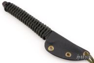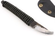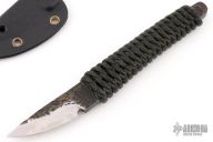This neck knife features a hand forged blade with "brute de forge" flats and scandi polished bevels. Handle is wrapped in mil-spec 550 cord and epoxied. Comes with Kydex sheath with neck cord. Has a couple light scuffs and scratches, excellent condition otherwise.