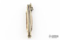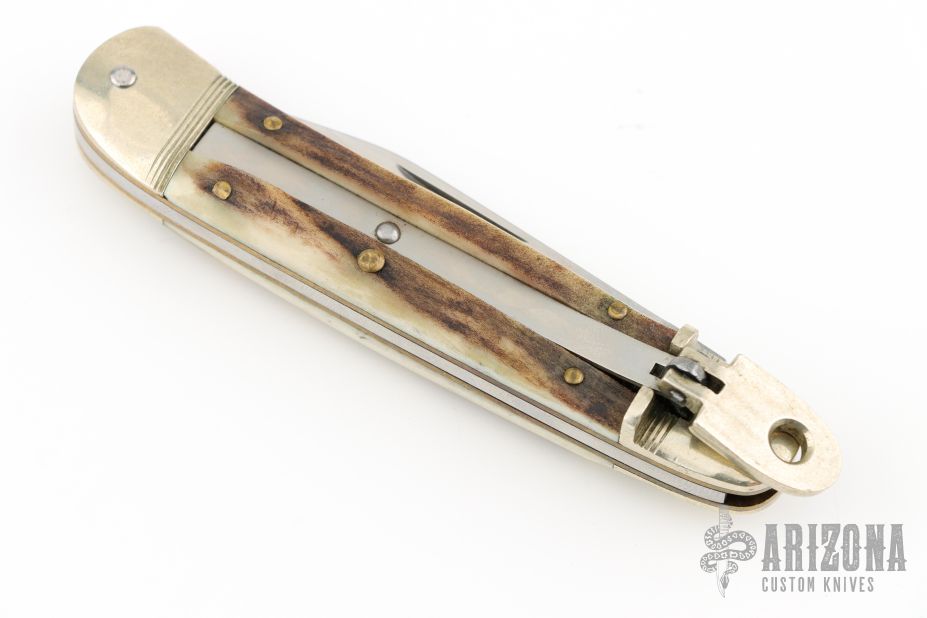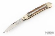 This leverlock auto by Hubertus features a mirror polished blade, nickel silver double bolsters, stag scales, nickel silver liners and brass pins. Opens with a nice snap. Very fast opening. Has scratches otherwise the knife is in good condition.