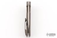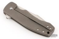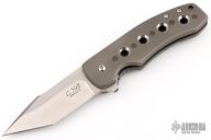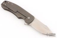 This Templar Framelock flipper by Chad Nell has a satin finished tanto blade with flipper and notched thumbrest. Handle has a bead blasted titanium frame with copper pin accents, matching titanium tip up clip. Nice detent, lockup and blade seating. Rides on bearings.. Has some light scuffs on the frame, otherwise excellent condition.