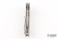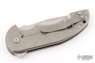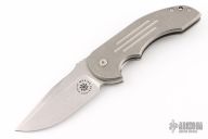 This Crossfire Mid-Tech from David Mosier has a Clip Point CPM 154 blade with stone washed finish. Thumb ramp with jimping provides excellent purchase. The sculpted titanium frame has a fuller pattern milled on the non lock side. Open frame design and titanium standoffs make for very lightweight carry EDC knife. Knife has a tip up, right hand carry titanium pocket clip. Great blade centering, crisp detent and nice lock up with zero blade play. Excellent Condition. Comes with a zippered case.