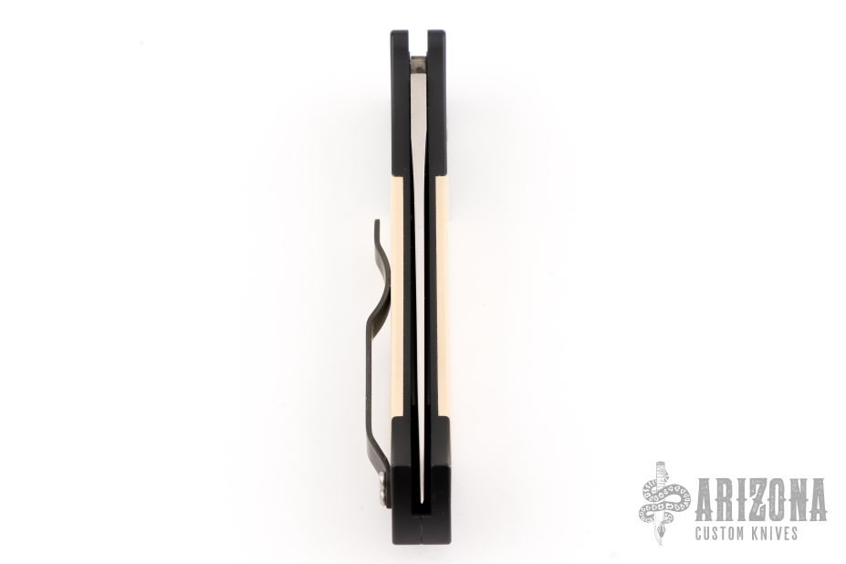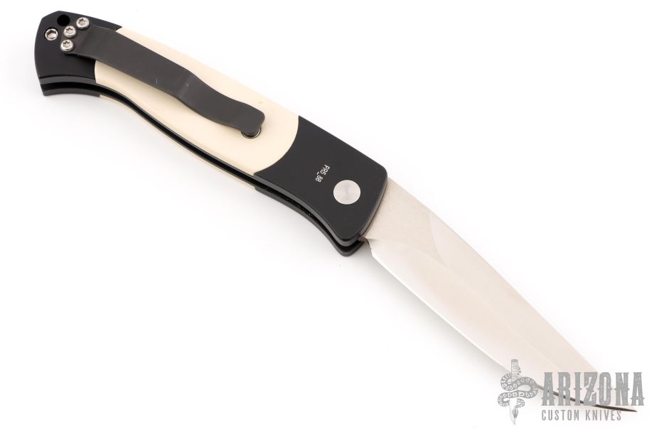 The Brend Auto by Pro-Tech Knives features Walter Brend's famous "Model 1" blade shape in a small package. Coil spring side-opening automatic. It has a satin finished blade and black aluminum handle with ivory micarta inlays, tip up black stainless steel clip. PR5 #88. Has some scuffs and scratches, excellent condition otherwise.
