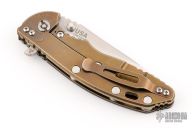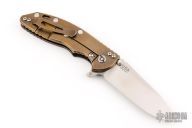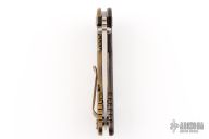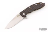 This 3.5" Slicer XM-18 flipper from Hinderer Knives has a satin finished blade with notched thumbrest and flipper, no choil. Red Carbon fiber scale and a stonewash bronze titanium frame and clip. Reversible pocket clip. Strong lock up, nice detent and blade seating is center. Includes original box, extra washers, and papers. Has a couple light scuffs and scratches, great condition otherwise.