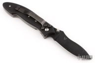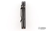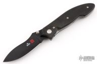 This ND-2 Nomad by Al Mar Knives features a black spear point blade with dual thumbstuds and notched thumbrest. The handle has black G-10 scales, stainless steel liners and tip down clip. Nice detent, lockup and blade seating. Has some light scuffs, otherwise excellent condition. Comes with original box. Hidden D/A scale release in scale at the pivot area. Fires hard.