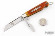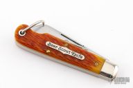 This Beer Scout from Great Eastern Cutlery features a satin finished 1095 carbon steel blade and secondary bottle opener. The handle has nickel silver bolster, Golden Ale Jigged Bone covers, brass liners and steel springs. Comes with original tube. Has a couple light scratches, a couple small oxidation spots on the blade, otherwise good condition.