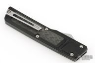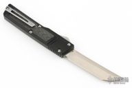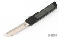 This Ripper OTF Auto by Vespa Knives features a satin finished tanto blade. The handle has a black aluminum frame with carbon fiber inlays, tip down titanium clip. Comes with a zippered case. Has a couple light scuffs, excellent condition otherwise.
