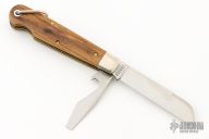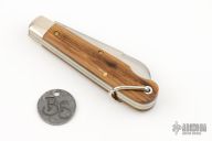 This Beer Scout from Great Eastern Cutlery features a satin finished 1095 carbon steel blade and secondary bottle opener. The handle has nickel silver bolster, Charred Barrel Oak covers, brass liners and steel springs. Comes with original tube. Has a couple light scratches, otherwise excellent condition.