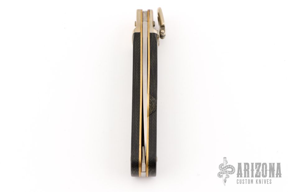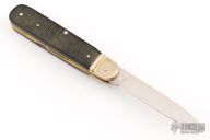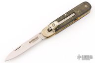 This Leverlock Folder from Boker features a drop point satin finish blade with nail nick. The handle is comprised of nickel silver bolsters and lever with black micarta scales over brass liners stainless steel backspacer. Includes original box and papers. Has some scuffs and patina, great condition otherwise. #340.