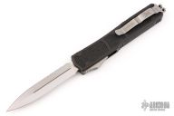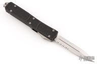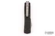 This Makora OTF automatic by Microtech features a satin finished partially serrated double edge blade. The handle has a black aluminum frame with nonslip inlays. Black stainless steel clip, tip down carry. Dated 07/2003 and #477 on clip. Includes the original tube, papers, original nylon belt sheath. Has a couple light scuffs on the body, otherwise Excellent condition.