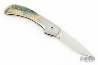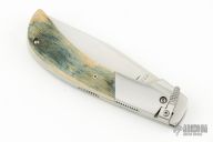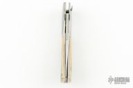 This automatic by RB Johnson features a hand-rubbed satin finish blade. The handle has satin finished stainless steel bolsters, and mammoth ivory scales, fileworked stainless steel liners and backspacer. The knife is easily opened by pressing your thumb against the checkered part of the bolster and sliding it forward. Doing the same when the knife is open will release the lock and allow you to close the knife. Strong and fast automatic opening. Excellent fit and finish. There are some light scratches, otherwise excellent condition.