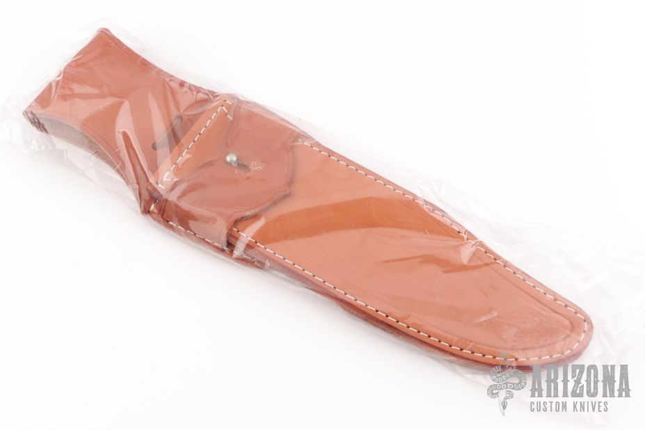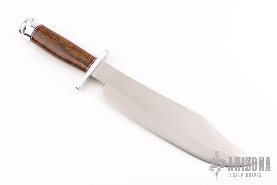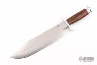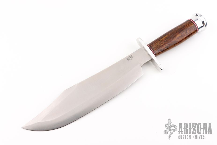 This Bark River Knives Shining Mountain Bowie features a satin finish blade with false top edge, .249" blade stock and 2.277" blade depth, hidden tang construction. The handle is comprised aluminum guard and pommel with red, white and black spacers and a desert ironwood grip. Includes leather sheath with belt loop. Comes with original box and papers. Excellent condition.