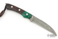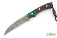 This knife by Master Smith J Neilson was made before he was a Journeyman Smith or Mastersmith in the ABS, it features a Damascus blade with notched thumbrest, .103" blade stock and .706" blade depth, full tang construction. The handle has malachite bolsters and desert ironwood burl scales with black liners. Excellent condition.