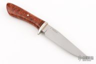 This Hunter by Master Smith J Neilson features a hand rub satin finished blade with .202" blade stock and 1.118" blade depth, hidden tang construction. The handle has a nickel silver guard, burlwood grip with black and orange/black stone spacer. Has some light scratches and a couple small oxidation spots, otherwise good condition. This knife was made before his Master Smith rating was achieved.