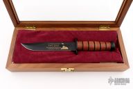 This KA-BAR fighting knife was part of a limited run done for the 60th anniversary of Iwo Jima. The black coated clip point blade with swedge and fullers features commemorative artwork to mark the 60th anniversary of "Honoring 60 Years Iwo Jima Uncommon Valor was a Common Virtue". The handle is comprised of a black coated steel guard and pommel with stacked leather handle over hidden tang construction. Excellent condition. Comes with a wooden and glass display case.