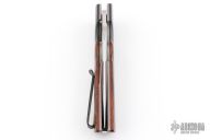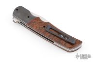 This knife features a satin finished clip point blade with a false top edge and checkered flipper. The handle has Fat Carbon bolsters, ironwood scales, a titanium frame, stainless steel backspacer and a tip up titanium clip.  Runs on IKBS bearings Perfect detent, lockup and blade seating. Amazing flipping action. Includes a padded zippered case.  Excellent Condition.