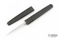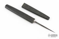 This very rare Defense Spike was made by renowned Northwest knifemaker Rod Chappel. The green Micarta handle is brought to a high polish and features jimping for extra grip. The entire knife and sheath weighs only 1 ounce, making it a perfect backup defense spike. A matching Micarta sheath makes the spike easy to carry in the pocket. The 2.5 inch blade is a broad triangular grind, combining three hollow grinds. It is scalpel-sharp, needle-pointed and a very lethal....and messy....weapon. The blade is inscribed "Roderick Caribou Chappel .… Spike". Includes a padded zippered case. Excellent Conditon.