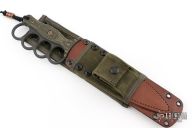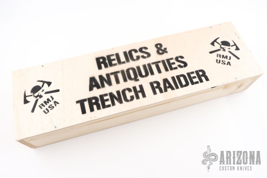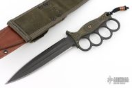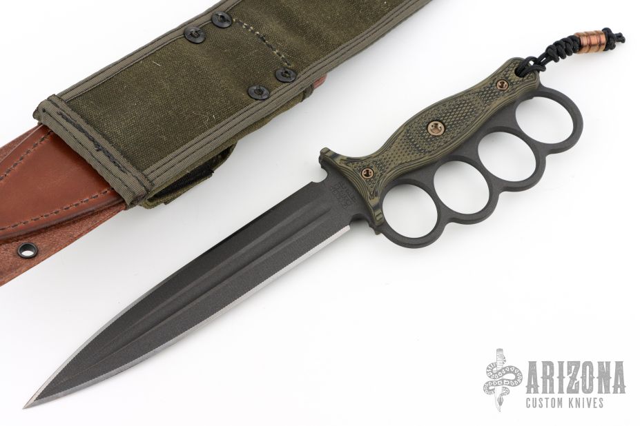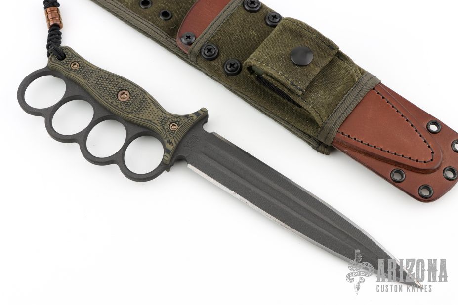 Embodying history and our own design philosophies, the Trench Raider is our rendition of the classic trench knife. We decided to make something that was more true to size vs the behemoth that is Lady Death. The Trench Raiders overall length is 11 3/8" overall length, and has a 7 3/16"" CPM-3V double-edge dagger blade featuring a long fuller down the center. The knuckle duster style handle acts as a guard to protect your hands, and the aggressive outward shape works well for raking. A small detail regarding the knuckles, the style is patterned after the knuckles that President Lincoln's bodyguard carried. The handle is finished with G10 scales with a checkered texture that is suitable in dry or wet conditions. The handles are attached with Grade 5 Titanium fasteners that are electro-anodized in bronze to round out the look. Trench Raider includes a leather and canvas sheath that has a pouch for a lighter mounted on the front. There is also a lighter included, most look like what is pictured, however there are some easter eggs mixed in. The sheath is ambidextrous, and can be worn on a belt or attached to PALS webbing.