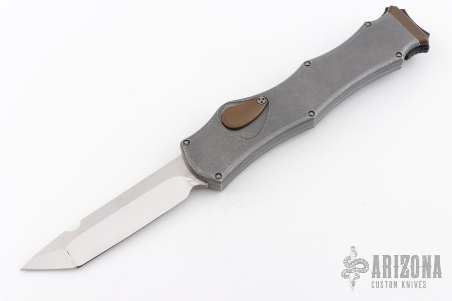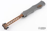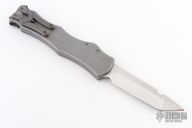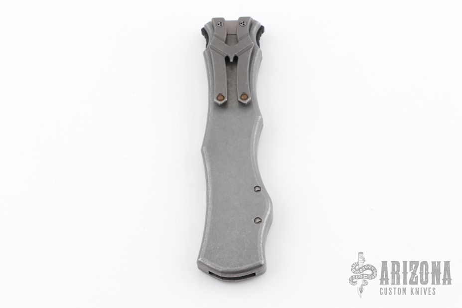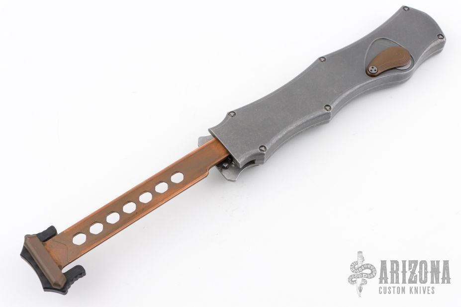 This Hydra by Heretic Knives (Anthony G. Marfione) is #002. It features a multiground tanto mirror polished blade with satin flats. The handle has a Royalloy stainless steel tumbled frame, tumbled stainless clip with copper ball inserts, Chromium Copper and carbon fiber charging handle and a Copper button cover. Comes with original box, zippered case and COA. Excellent condition.