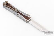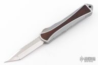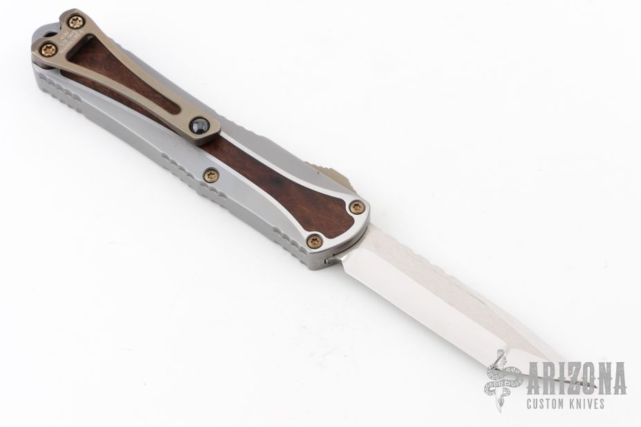 This Manticore S by Heretic Knives features a mirror polished multi-ground tanto blade. The handle has a two-tone stainless steel frame with desert ironwood burl inlays, stainless thumb slide and a tip down anodized titanium clip with ceramic ball. Comes with original box, a zippered case (Not Original) and COA dated 08/21 and s/n 003. Excellent condition.