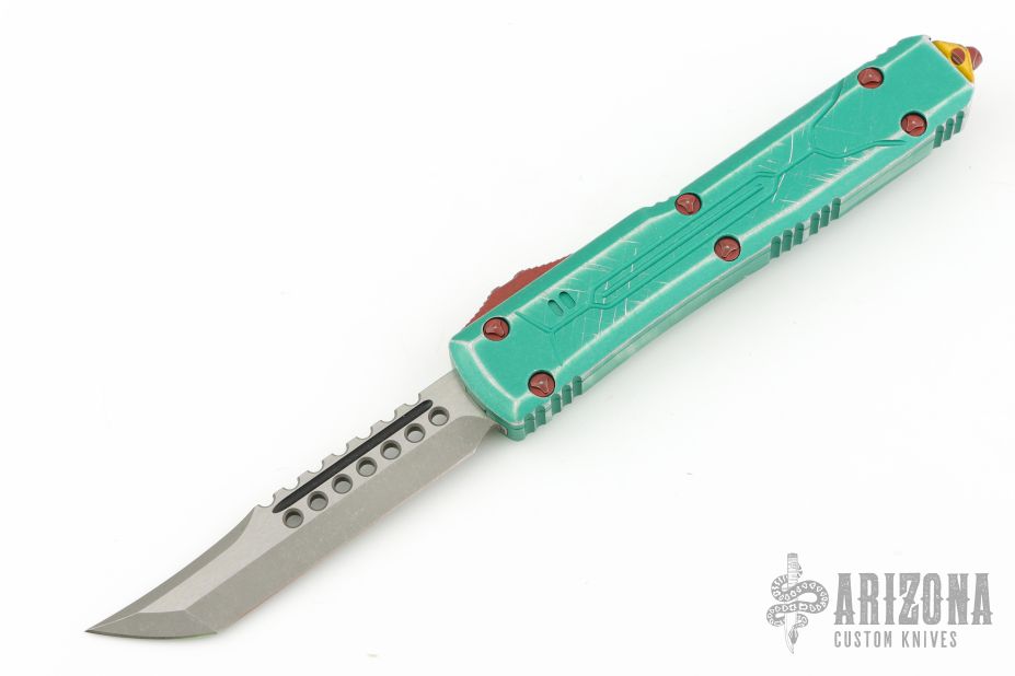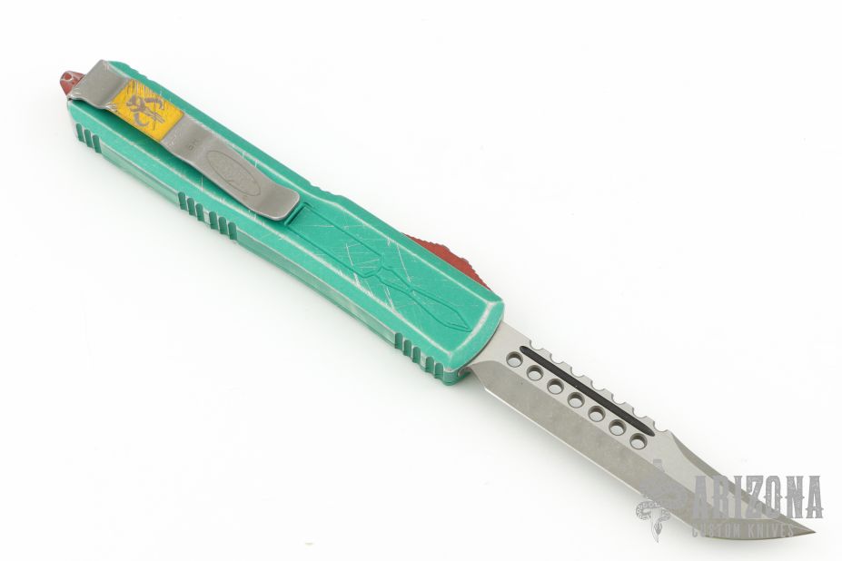 This StarWars themed Ultratech by Microtech knives features a Hellhound tanto blade with fullers and apocalyptic finish. The handle has a green battle worn aluminum frame with red and yellow hardware. Comes with original box and papers. Dated 08/2019. Excellent condition.