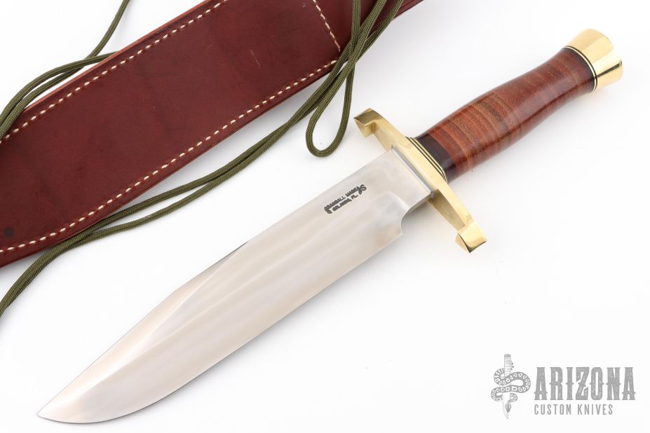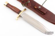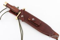 The Model 12 was made to meet the demand for a heavy-duty sporting knife of the Bowie type. This knife has a 9" stainless steel blade with sharpened top edge, .231" blade stock and 1.784" blade depth, hidden tang construction. The handle has a lugged brass guard, stacked leather grip with black/brass spacers and a brass butt. Includes a brown leather sheath and a Randall zippered case. Excellent condition.