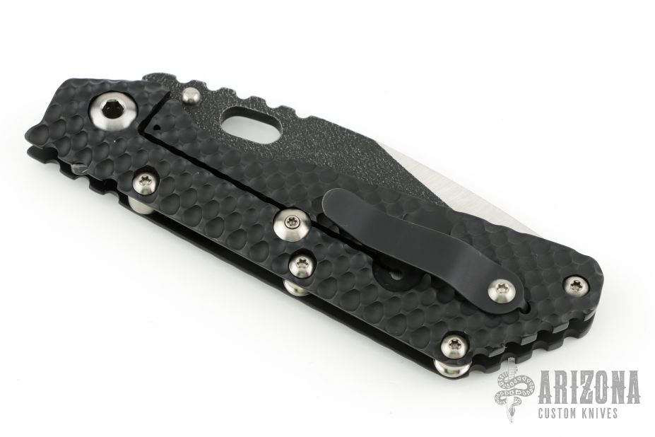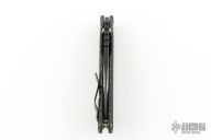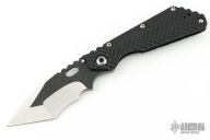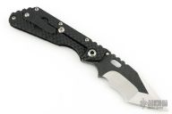 This Mick Strider custom XL framelock folder has a Rhino Yeti acid etched blade with notched thumbrest and thumbhole. The handle has a black double gunner grip titanium frame with matching titanium clip. Includes Hinderer "Lock Bar Stabilizer" for maximum reverse lock retention. Nice lockup, blade seating and detent. Includes a velcro case. Signed in the choil, marked 20cv on the blade. Excellent Condition.